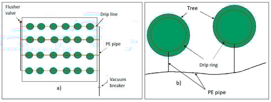 - DIG. Irrigating Trees with Drip Irrigation. 2018. Archived by WebCite®. Available online: http://www.webcitation.org/710T2LlDn (accessed on 18 July 2018).
