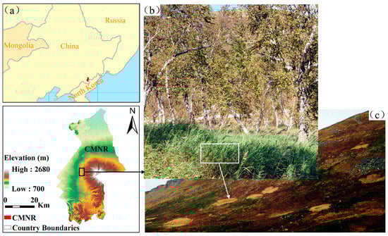 Location of the Changbai Mountain Nature Reserve (CMNR) in Northeastern China (a), mountain birch and Deyeuxia angustifolia (inset) communities in mountain birch forests located between 1700 and 2000 m (b), and alpine tundra (above 2000 m) with patches of encroaching D. angustifolia located on the western aspect of the Changbai Mountains (c).