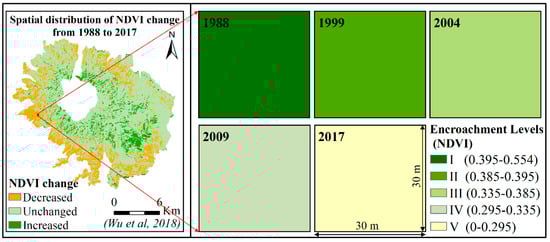 Location of our sampling area in alpine tundra (above 2000 m) of Changbai Mountains (on the left of figure []) and NDVI of the time-series satellite images of communities with different D. angustifolia encroachment levels in the sampling area (on the right of figure).
