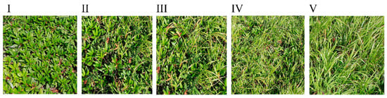 At each of our plots, we classified the D. angustifolia encroachment into one of five levels based on the percentage of cover of D. angustifolia and R. aureum: no encroachment (I) (cover of D. angustifolia 0%; R. aureum 100%), low encroachment (II) (0% < cover of D. angustifolia ≤ 30%; 70% ≤ cover of R. aureum < 100%), medium encroachment (III) (30% < cover of D. angustifolia ≤ 70%; 30% ≤ cover of R. aureum < 70%), high encroachment (IV) (70% < cover of D. angustifolia < 100%; 0% < cover of R. aureum < 30%), and complete encroachment (V) (cover of D. angustifolia 100%; R. aureum 0%) (Figure 3). Communities with no encroachment or complete encroachment were monoculture communities that included only R. aureum or D. angustifolia. Mixed communities at a low encroachment level, a medium encroachment level, and a high encroachment level with unitary structures included a mixture of the two. We did not consider other plants in these communities because of their low abundances.