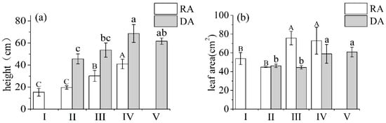 Plant height (a) and average leaf area (b) of Deyeuxia angustifolia (DA) and Rhododendron aureum (RA), in plant communities under five encroachment levels. Different capital and lower-case letters indicate significant differences among RA and DA, respectively, at the five encroachment levels (p < 0.05) according to two-way ANOVA with Fisher’s least significant difference (LSD) test.