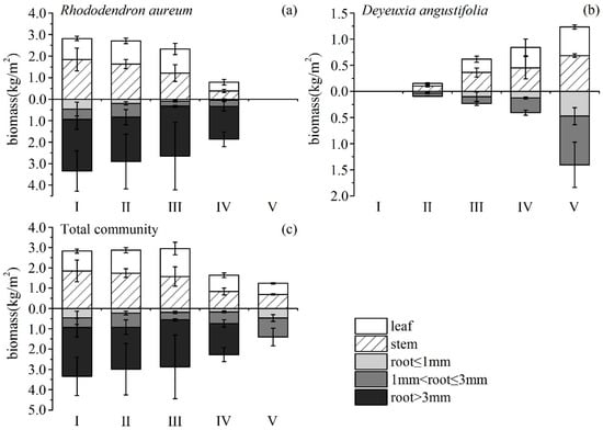 Biomass of different parts of Rhododendron aureum (a), Deyeuxia angustifolia (b), and the whole community (c), under five encroachment levels.