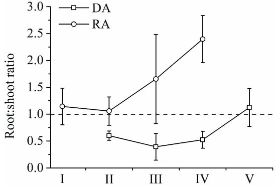 Root/shoot ratio of R. aureum and D. angustifolia under five encroachment levels.