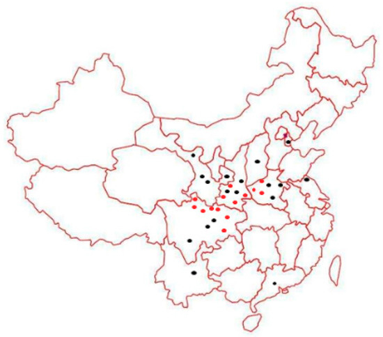 Sites (red dots) for rust sampling of P. deltoides cv. ‘Zhonghua hongye’. Dark dots represent the potential distribution of this formerly rust-free cultivar.