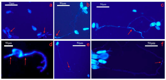 Fresh urediniospores were collected to test germination and to observe nuclei. Dry fresh urediniospores were sprayed on the surface of 2% agar water and sealed in the dish with a little water to maintain 100% relative humidity. After 6 h, 10 h, and 16 h incubation at 25 °C in the dark, urediniospores and germination tubes were dyed by DAPI (4′,6-diamidino-2-phenylindole∙2HCl, Sigma Chemical Company, St. Louis, MO, USA) ethanol solution and observed with a Leica DM4000B [28,29].
