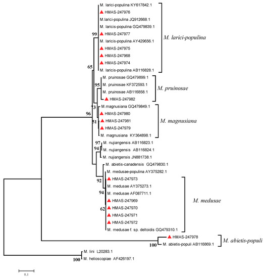 Maximum Likelihood (ML) phylogenetic tree of nrDNA-ITS sequences of species of Melampsora from HMAS collections (red triangles) made during poplar leaf rust surveys in China, 2015–2018. Bootstrap values >50% are shown.