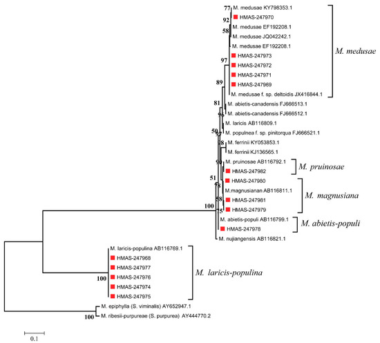 Phylogenetic analysis of rDNA ITS regions is shown in Figure 4. The Chinese samples belonged to five clades when M. lini (GenBank accessions: L20283 [38]) and M. helioscopiae (GenBank accessions: AF426197 [39]) were used as outgroups (Figure 4). The analysis revealed that five samples (HMAS-247973, HMAS-247969, HMAS-247970, HMAS-247971 and HMAS-247972) belonged to the clade anchored by M. medusae given the following GenBank accessions: AY375273 (representative of M. medusae in France), AF087711 (M. medusae in U.S.A. [8]), GQ479310 (also a French sample of M. medusae [7]). Five specimens (HMAS-247976, HMAS-247977, HMAS-247975, HMAS-247968, HMAS-247974) belonged to the clade with M. larici-populina given the following GenBank accessions: AY429656 (M. larici-populina in Canada [40]), AB116828 (M. larici-populina in China [2]). Three specimens (HMAS-247979, HMAS-247980, HMAS-247981) were grouped in a clade with M. magnusiana given the following GenBank accessions: GQ479849 (representative of M. magnusiana in Germany [7]), KY364898 (M. magnusiana in Italy [41]). M. pruinosae and M. allii-populina were divided into two separate clades anchored by GenBank accessions AB116858 (M. pruinosae in China [2]) and AB116869 (M. allii-populina in China [2]), respectively (Figure 4), M. pruinosae is closely related to M. magnusiana. nrDNA-ITS phylogeny clearly distinguished M. medusae from the other four Melampsora species of poplars that were found in these surveys in China.