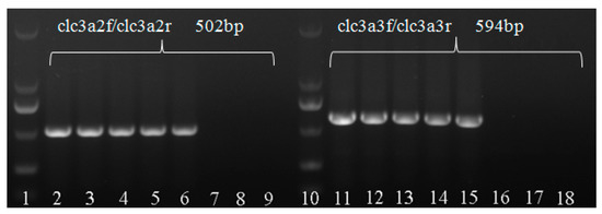 Amplification with primer clc3a2f/clc3a2r and primer clc3a3f/clc3a3r. Lanes 1 and 10: Marker DM2000; lanes 2–6: Amplification from uredinia of the five specimens of M. medusae (HMAS 247969-71, HMAS 247972-73) using primers clc3a2f/clc3a2r; Lanes 11–15: Amplification from uredinia of the five specimens of M. medusae (HMAS 247969-71, HMAS 247972-73) using primers clc3a3f/clc3a3r; Lanes 7–8 and 16–17(HMAS247968, HMAS247978): The positive control with DNA of M. larici-populina; Lanes 9 and 18: The negative control with ddH2O.