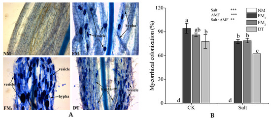 Development of the three arbuscular mycorrhizal fungi in Z. serrata seedling roots. (A) represents the figure of colonization status. (B) represents the figure of mycorrhizal colonization. CK represents the control without salt and AMF. NM represents the control treatments without AMF, FM1 represents treatments inoculated with the AMF Funneliformis mosseae 1, FM2 represents treatments inoculated with the AMF Funneliformis mosseae 2, DT represents treatments inoculated with the AMF Diversispora tortuosum. Different lowercase letters indicate significant differences between the three AMF under control and salt stress at the 0.05 significance level; NS not significant, * p < 0.05, ** p < 0.01, *** p < 0.001.