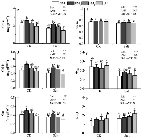 The Fv/Fm, ФPSⅡ, and NPQ were significantly affected by salt stress, whereas only NPQ was significantly influenced by AMF (Figure 3D–F). Salt stress decreased ФPSⅡ by 41.86% (p < 0.05) and increased NPQ by 100.42% (p < 0.05). Among the three AMF groups, the DT group exhibited the most positive effect on ФPSⅡ under CK, but presented the least positive effect on ФPSⅡ under salt stress conditions. The FM1, FM2, and DT groups demonstrated 31.38%, 17.90%, and 2.66% increase in ФPSⅡ, respectively. In addition, the AMF groups exhibited higher mean NPQ, when compared with the NM group, and the increase was significant under CK. In particular, the DT group showed 32.42% increase in the value of NPQ.