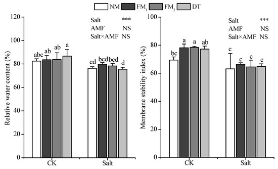 The leaf relative water content and membrane stability index were significantly affected by salt stress. The leaf relative water content in the AMF groups was higher than that in the NM group. Under CK, the FM1, FM2, and DT groups presented 1.46%, 1.69%, and 5.17% increase in leaf relative water content after inoculation, respectively; however, under salt stress conditions, the values increased by 4.58% and 2.50% after inoculation with FM1, FM2, respectively, but decreased by 1.07% (p < 0.05) after inoculation with DT. Membrane stability index of leaf in the FM1, FM2, and DT groups slightly increased after AMF inoculation, presenting 12.68%, 13.11%, and 11.24% increase under CK and 5.22%, 1.61%, and 2.53% increase under salt stress conditions, respectively (Figure 4).