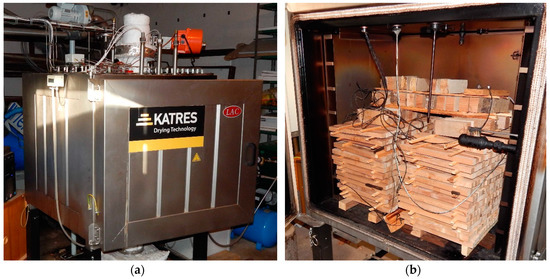 A third of the primary test specimens were subsequently subjected to thermo-treatment in an air atmosphere at 170 °C, then a different third at 190 °C, in accordance with the known Finnish patent for the thermal modification of wood, Pat. EP-0759137 [29,37]. The production was carried out in a laboratory high temperature chamber A type KHT (Katres Ltd., Jihlava, Czech Republic), see Figure 3, with a filling capacity of 0.38 m3, a maximum load capacity of 150 kg, a maximum operating temperature of 250 °C and a power consumption of 3 kWh. During the treatment we used a water curtain spray unlike the steam used in Finnish technology. The detailed course of the production is shown in Figure 4. The thermally modified test specimens were then air conditioned again to equilibrium moisture content in an environment with a relative humidity of 65 ± 5% and a temperature of 20 ± 2 °C.