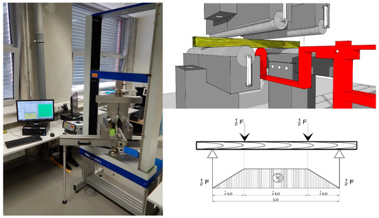 Static bending strength (MOR) and modulus of elasticity (MOE) were determined on the Tira 50 kN testing machine (Tira GmbH, Schalkau, Germany) under the load of two forces at quarter distances from the supports to eliminate shear stress (see Figure 5) [53,54].