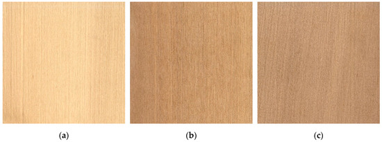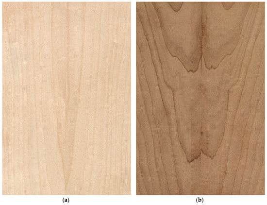 (a) Sample of untreated birch veneer. (b) Sample of treated veneer under a temperature of 200 °C for 2 h.