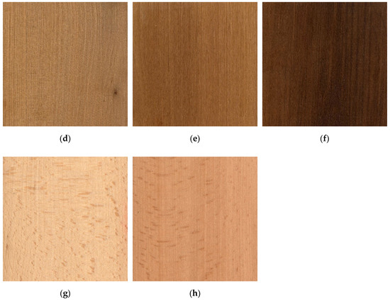 (a) Untreated birch, (b) birch treated at 160 °C, (c) birch treated at 170 °C, (d) birch treated at 180 °C, (e) birch treated at 190 °C, (f) birch treated at 200 °C, (g) untreated beech, (h) steamed beech.