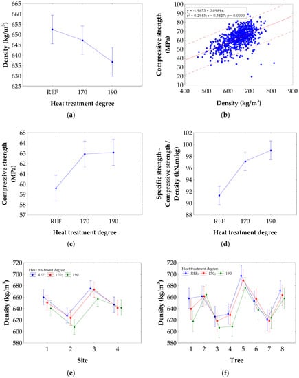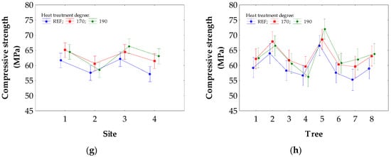 Graphic visualization of the effect of heat-treatment temperature on (a) wood density, (c) compressive strength and (d) specific compressive strength. Graphic visualization of the effect of heat-treatment temperature and site on (e) density and (g) compressive strength. Graphic visualization of the effect of heat-treatment temperature and tree on (f) density and(h) compressive strength. The relationship between density and compressive strength, regardless of the heat-treatment degree, is shown in (b). Significance level is 95%. REF = reference, with no treatment; 170 = heat treatment at 170 °C; 190 = heat treatment at 190 °C.