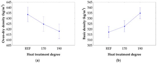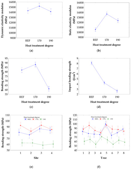 The paper includes the results of a single-factor analysis of Figure 7a,c,d, Figure 8a–e, Figure 9a–d,i and Figure 10 (impact of heat treatment), and a two-factor analysis of Figure 7e–h, Figure 8g,h, Figure 9e–h,j–l and Figure 11 (impact of heat treatment and stand, or stem or cycles of repeated swelling and shrinkage), while the connecting line in the graphs between individual stands (sites) or stems are here only for better clarity and trend analysis (in fact, they should not be joined). At the same time, the existing known correlations between the static and dynamic modulus of elasticity and compressive strength on density (Figure 7b) and swelling on density (Figure 8f) were confirmed, in regards to the dependence of all of the samples (i.e., reference and thermally modified) [62]. It was also shown that elastic properties responded to heat treatment more positively than strength properties; see Figure 9b,c, which exhibited 22% increase in static bending strength at 170 °C, and up to 43% at 190 °C in favor of elasticity. It was also shown that dynamic stress (Figure 9d) was much harder on the heat-treated wood than static stress (Figure 9c) because of the higher brittleness—although the hardness, at least on the surface layers, was relatively higher (see Figure 9i,j). At 170 °C, this difference was approximately 56% and at 190 °C approximately 41%, to the detriment of dynamics.