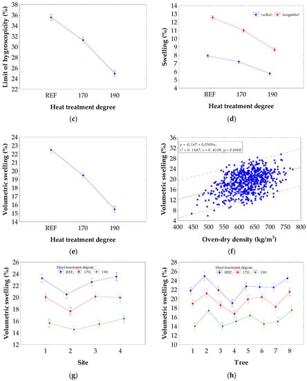 Graphic visualization of the effect of heat-treatment temperature on (a) oven-dry density, (b) basic density, (c) limit of hygroscopicity (fiber saturation point—FSP), (d) radial and tangential swelling, and (e) volumetric swelling. (f) The relationship between density and volumetric swelling, regardless of the heat-treatment degree. (g) Graphic visualization of the effect of heat-treatment temperature and site on volumetric swelling. (h) Graphic visualization of the effect of heat-treatment temperature and tree on volumetric swelling. Significance level is 95%. REF = reference, with no treatment; 170 = heat treatment at 170 °C; 190 = heat treatment at 190 °C.