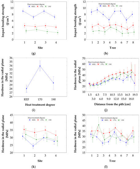 Graphic visualization of the effect of heat-treatment temperature on (a) dynamic elasticity modulus, (b) static elasticity modulus, (c) bending strength, (d) impact bending strength and (i) hardness in the radial plane. Graphic visualization of the effect of heat-treatment temperature on (j) hardness profile in the horizontal direction along the radius of the tree. Graphic visualization of the effect of heat-treatment temperature and site on (e) bending strength, (g) impact bending strength and (k) hardness of the radial plane. Graphic visualization of the effect of heat-treatment temperature and tree on (f) bending strength, (h) impact bending strength, and (l) hardness in the radial plane. Significance level is 95%. REF = reference, with no treatment; 170 = heat treatment at 170 °C; 190 = heat treatment at 190 °C.