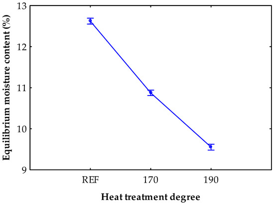 The equilibrium moisture content of birch wood after heat treatment and subsequent air conditioning at temperature 20 ± 2 °C and a relative humidity of 65 ± 5%. Significance level is 95%. REF = reference, with no treatment; 170 = heat treatment at 170 °C; 190 = heat treatment at 190 °C.