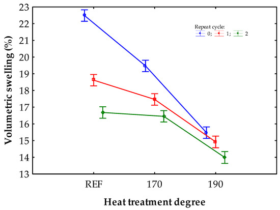 The change of volumetric swelling after repeating one and two cycles of storage under the water surface and re-drying. Significance level is 95%. REF = reference, with no treatment; 170 = heat treatment at 170 °C; 190 = heat treatment at 190 °C.