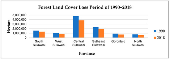 The decline in forest cover area in the period of 1990–2018 shows that the largest forest cover loss occurred in North Sulawesi Province, which was 23.29%, and the smallest occurred in South Sulawesi Province (13.57%). The decrease in forest cover area from the period of 1990–2018 can be seen in Figure 1.