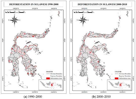 Data analysis was carried out by utilizing the overlay results between land cover change and district administration in all provinces in Sulawesi in several periods of years. The first analysis was the analysis of deforestation. The analysis of deforestation was carried out for the period of 1990–2000, 2000–2010, and 2010–2018 and produced spatial data and extensive deforestation per period. Furthermore, the rate of deforestation was analyzed in all observation periods. Annual deforestation is calculated by the annual rate of change in forest cover which is derived from multiple interest laws [33,34]. The annual deforestation rate (r) is recommended because it is more intuitive than the formula used by FAO (q) [35]. In some research results, the value of r is always higher than q. The difference in the value of both is lower than the value of sampling error [35].