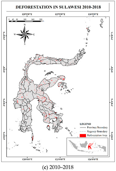 The spatial pattern of deforestation in Sulawesi in (a–c).