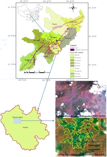 The main objectives of this study are (1) to characterize the spatial variability of damaged vegetation at different aggregation levels in the Wenchuan earthquake-affected area, (2) to identify the representative components of damaged vegetation, and (3) to clarify the main influencing factors on the spatial variability of damaged vegetation.