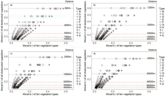 The relationships between the correlograms of the Moran’s I of ten vegetation types and those of all the destructed vegetation at four different aggregation levels including (a) the 1 × 1 aggregation level, (b) the 2 × 2 aggregation level, (c) the 4 × 4 aggregation level, and (d) the 8 × 8 aggregation level. The points in black are significant (P < 0.001). The vegetation type abbreviations are defined in Table 4.