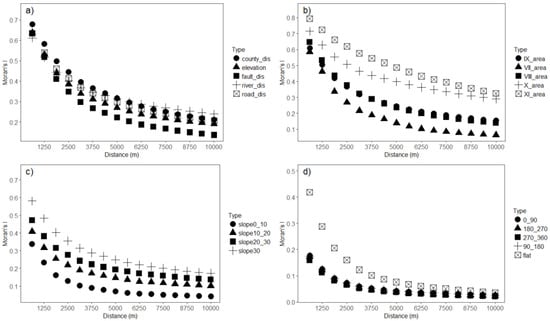 The correlograms of the Moran’s I in 19 potential driving factors at the aggregation level 1 × 1. (a): Correlograms with Moran’s I in the distances of factors and elevation; (b): Correlograms with Moran’s I in seismic intensity zones; (c): Correlograms with Moran’s I in slope classes; (d): Correlograms with Moran’s I in slope aspects. The points in black are significant (P > 0.001). The driving factor abbreviations are defined in Table 4.