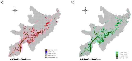 Cluster (a) and significance (b) maps of local indicators of spatial association (LISA) for all damaged vegetation at the 1 × 1 aggregation level.