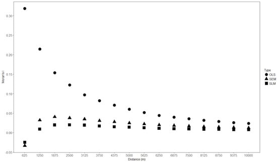 The spatial autocorrelation in the residuals of spatial lag and spatial error models weakened (Figure 6). Furthermore, the difference in their spatial autocorrelations was negligible. Compared to the spatial lag and spatial error models, the standard linear model had larger residuals with a positive spatial autocorrelation. For example, as seen in Table 8, more grids with a comparatively higher/lower original value of the residuals of the standard linear model are switched from positive/negative to negative/positive or less positive/negative. Therefore, the residuals of the spatial error model are considerably lower.