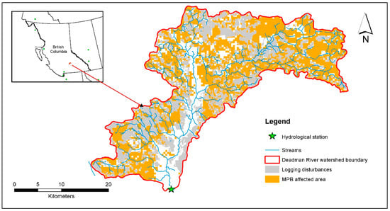 The location of watershed boundary, hydrometric station, stream network, forest logging, and mountain pine beetle (MPB) infestation of the Deadman River watershed, located in British Columbia, Canada.