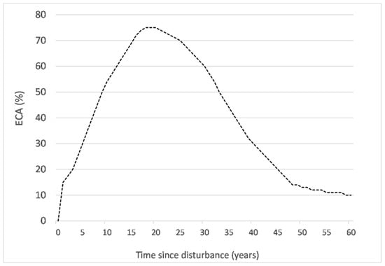 Equivalent clear-cut area (ECA) (%) since year of disturbance by mountain pine beetle (MPB).