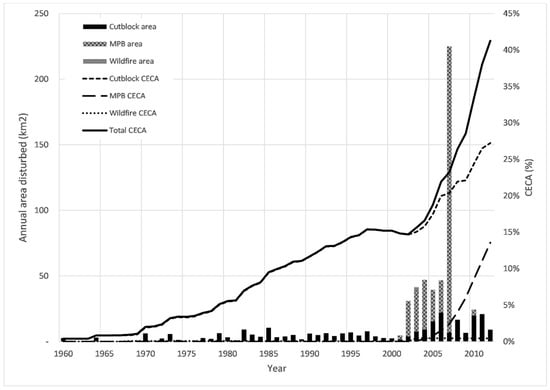 In 2012, the CECA was 41.3% of the watershed area (Figure 3). Logging was the dominant disturbance type through the study period. The average annual harvest rate in the Deadman River watershed was 4 km2 year−1 from 1960 till 1999. From the year 2000 onwards, this rate increased to an average of 11 km2 year−1. In 2012, the CECA from logging was 27.2% of the watershed area. MPB affected a total of 370 km2 since 2000, a rate of 46 km2 year−1 (Figure 3). The CECA of MPB in 2012 was 13.6%. Wildfire is an insignificant disturbance agent during the study period with only 3 km2 in total. The total CECA rose from 0% in 1960 to 41% in 2012. Overall, the Deadman River watershed has experienced significant forest disturbance.