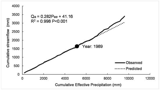 A modified double mass curve (MDMC) is a graph of cumulative annual Qmean versus cumulative effective precipitation (Pe) which is the difference between annual P and actual evapotranspiration (AET) [,]. Annual potential evapotranspiration (PET) was estimated as the average of the Priestley–Taylor [] and Hamon method [,,] and then AET was calculated as the average of the Budyko [] and Zhang’s [] equations. The basic assumptions of the MDMC are 1) the linear relationship holds between the Pe and Qmean; and 2) all climate variability is lumped into P and ET [,]. In a period with no forest disturbance (reference period), the slope of the MDMC should be straight, and a break point in this line suggests a regime shift in annual mean flow caused by forest disturbance (disturbance period) []. The Pettitt break point test was introduced to detect the statistically significant break point between the reference and disturbance periods []. Before carrying out the Pettitt test, autocorrelations in the MDMC slope were removed following the methodology found in Yue et al. []. To validate the statistical significance of the break point, the nonparametric Mann–Whitney U test Z statistic was adopted [,,]. The linear relationship in the reference period was used to predict the cumulative annual streamflow for the disturbance period, with the difference between this and the observed line regarded as the cumulative impact of forest change on streamflow (∆Qf). The deviations caused by climate variability on each annual streamflow component can be determined using Equation (1).