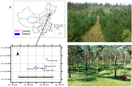 Location of the five Mongolian pine stands (a) and pictures of the 12-year-old (b) and 58-year-old (c) Mongolian pine stands.