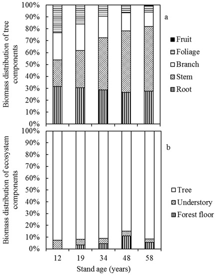 The biomass distribution varied in the five stands of different ages (Figure 2a). The biomass distribution pattern for tree components was root > foliage > branch > stem > fruit for the 12-year-old stand and stem > root > branch > foliage > fruit for the other four stands. For all stands, the proportion of fruit biomass was lowest, less than 1%. Except for the 12-year-old stand, the stem had the largest proportion of biomass among all components. With increasing stand age, the proportion of stem biomass increased gradually with values of 22.2%, 31.1%, 43.9%, 51.7%, and 54.2% in the 12-, 19-, 34-, 48-, and 58-year-old stands. With increasing age, the proportion of branch biomass and foliage biomass decreased from 22.9% and 23.3% in the 12-year-old stand to 12.1% and 5.2% in the 58-year-old stand. The contribution of root biomass to total tree biomass was 31.7%, 30.5%, 28.7%, 26.6%, and 27.7% in the five stands, showing a decreasing trend with the exception of the 58-year-old stand.