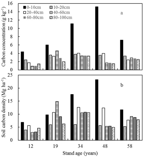 In the five age-sequence pine stands of this study, the soil carbon concentration was the highest in the surface 0–10 cm soil layer and showed a decreasing trend with increasing depth. Previous studies about soil carbon concentration with depth yielded the same results as our study [14,20,22,26]. Due to the lack of repeated stands of the same age and measurements of carbon concentration, the effect and significance of age on soil carbon density could not be analyzed. However, the mixed soil sample from three sampling sites was used for concentration analysis and calculating soil carbon density, which could represent the overall carbon density of the pine stand at that age.