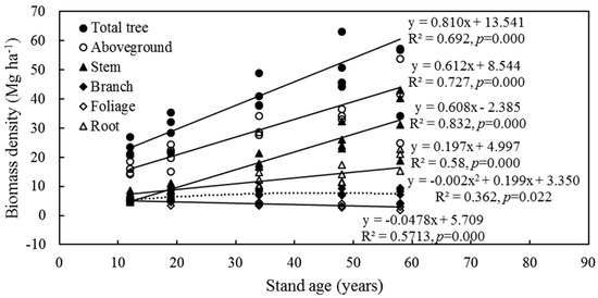 Age is the most important factor affecting the magnitude and distribution of biomass in plantation ecosystems [13,42]. With increasing stand age, the total tree, aboveground, stem and root biomass of Mongolian pine increased, displaying a linear increase in this study (Figure 4). Similar results were reported in previous studies [19,21]. A linear positive correlation between age and total tree, aboveground, stem and root biomass could be extracted for the white pine plantations with ages of 2 to 65 years [13], and the total tree, aboveground and stem biomass increased with age following power functions for Mongolian pine [28]. For Korean pine in Li et al. [26], total tree biomass increased rapidly from the 8th to the 35th year and increased slowly during the 35th to the 51st year, and the relationship between root biomass and age showed a sigmoidal pattern with a decreasing trend of root biomass from the 35th to 51st year. This change pattern after planting could also be found in many previous studies [21,27,42,43]. From the 12- to the 48-year-old stand in this study, the tree branch biomass increased, and there was a slight decline in the 58-year-old stand, which could be described by a polynomial equation (Figure 4). The same pattern was also observed in previous studies [13,26,28]. Tree foliage biomass decreased from the 12th to the 58th year in this study and decreased from the 15th to the 65th year in white pine [13]. However, for Korean pine, foliage biomass increased from the 8th to the 35th year and decreased slightly in the 51st year [26]. These inconsistent relationships between foliage biomass and age might be due to differences in climate, soil condition, tree species and stand structure.