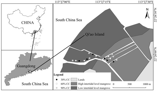 Sketch map of field trial sites in mangrove plantation at the Qi’ao Island. The abbreviations of sites refer to 30% canopy closure (30% CC), 60% canopy closure (60% CC) and 90% canopy closure (90% CC), respectively.