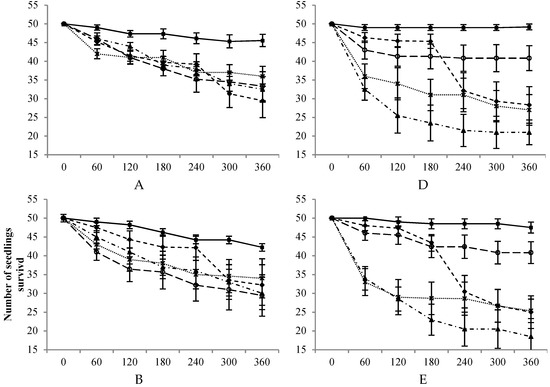 During the 360-day trial, the number of seedlings that survived decreased gradually and differed significantly among the five species. There was a significant interactive effect of light level and intertidal elevation on the number of seedlings that survived among A. corniculatum, B. gymnorrhiza, K. obovata, and R. stylosa. There was no significant interactive effect of light level and intertidal elevation on A. marina (Table 1).