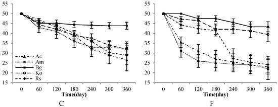 The number of seedlings of the five mangrove species surviving (Bg = Bruguiera gymnorrhiza, Ac = Aegiceras corniculatum, Ko = Kandelia obovata, Rs = Rhizophora stylosa, Am = Avicennia marina) (A) 30% canopy closure and high intertidal elevation, (B) 60% canopy closure and high intertidal elevation (C) 90% canopy closure and high intertidal elevation, (D) 30% canopy closure and low intertidal elevation, (E) 60% canopy closure and low intertidal elevation, (F) 90% canopy closure and low intertidal elevation.