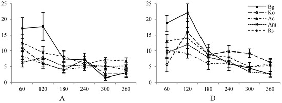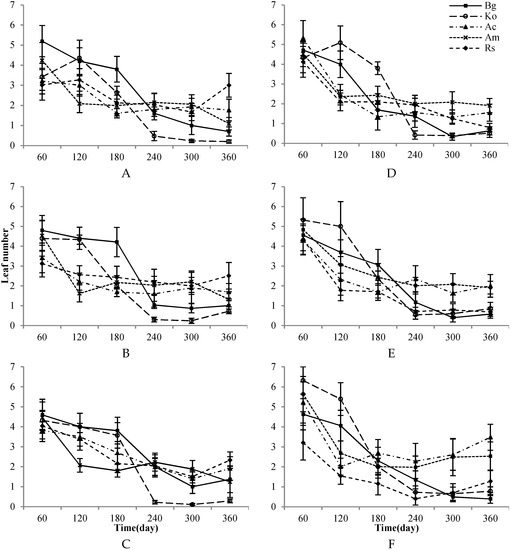 The leaf number of seedlings of the five mangrove species (Bg = Bruguiera gymnorrhiza, Ac = Aegiceras corniculatum, Ko = Kandelia obovata, Rs = Rhizophora stylosa, Am = Avicennia marina) (A) 30% canopy closure and high intertidal elevation, (B) 60% canopy closure and high intertidal elevation (C) 90% canopy closure and high intertidal elevation, (D) 30% canopy closure and low intertidal elevation, (E) 60% canopy closure and low intertidal elevation, (F) 90% canopy closure and low intertidal elevation.
