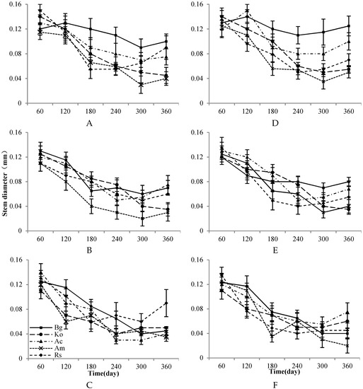 The stem diameter of seedlings of the five mangrove species (Bg = Bruguiera gymnorrhiza, Ac = Aegiceras corniculatum, Ko = Kandelia obovata, Rs = Rhizophora stylosa, Am = Avicennia marina) (A) 30% canopy closure and high intertidal elevation, (B) 60% canopy closure and high intertidal elevation (C) 90% canopy closure and high intertidal elevation, (D) 30% canopy closure and low intertidal elevation, (E) 60% canopy closure and low intertidal elevation, (F) 90% canopy closure and low intertidal elevation.