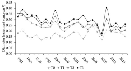 The lowest mean diameter increment was registered in the year 2010 (Figure 4): 0.16 cm∙year−1 in T1, 0.16 cm∙year−1 in T2 and 0.18 cm∙year−1 in T3. In the same year, T0 treatment recorded the second lowest mean of increment growth at 0.13 cm∙year−1. It is important to note that in this same year, the state of Amazonas experienced the largest drought recorded since 1953. In July 2009, an El Niño, out of season, was formed in the Pacific in which the peak occurred in October of the same year and extended until July 2010.