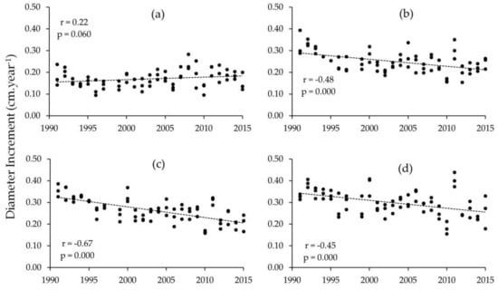 The graph shows the diameter increase for each treatment analyzed: Control (a); Low Intensity (b); Medium Intensity (c), and Heavy Intensity (d). It is possible to observe that in the plots where there was silvicultural intervention the diameter increment decreases with the passage of time. However, in the control plot the increment increased during the study period.