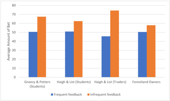 In Figure 1, we compare betting levels. We juxtapose our data with those of Gneezy and Potters [10] and Haigh and List [15]. The average bets from our frequent evaluation period is about 50, while that from the infrequent evaluation period is about 58. Our data show a similar pattern with that of Haigh and List (students). Since MLA predicts that the average bet from the infrequent evaluation period should be higher than that from the frequent evaluation period, our data show that forestland owners may exhibit MLA.