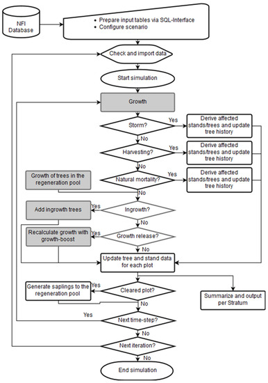 Forest development models have been used to predict the state and changes of forest systems for a long time. Among the first were yield tables that were developed to predict the yield of pure even-aged stands on the basis of long-term observations from experimental forest plots [4,5]. As yield tables represent growth of whole stands under fixed site conditions (i.e., site quality expressed as dominant tree height at a reference age), they can neither be transferred in time nor space. An alternative approach offer ‘process-based’ models [5]. These models incorporate empirically- and/or theoretically-derived relationships on ecological and eco-physiological processes, such as competition, photosynthesis, respiration, carbon allocation, and consequently growth of tree cohorts, individual trees or tree compartments. These relationships are considered fundamental and therefore assumed to be valid also under changing environmental conditions. However, process-based models are often difficult to parameterize, especially for applications over large spatial extents or at fine spatial resolutions. This led to the development of forest gap models and forest landscape models, which describe processes at a higher level of aggregation (i.e., tree growth vs. photosynthesis) with process-based and/or semi-empirical models based on ecological theory [6,7,8]. Especially over short time-scales (e.g., <30 years), these model types are less accurate in terms of timber harvest and growing stock estimates compared to pure empirical stand or sample-plot simulators at tree level. Consequently, their use for countrywide, spatially representative forest management scenario analyses is rather limited.